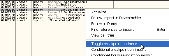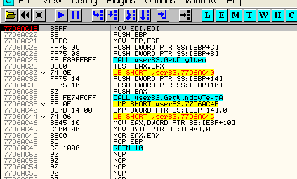 Видим, что используется GetDllItemTextA для получения серийного номера, введённого пользователем, и MessageBoxA для вывода сообщений, является ли серийным номер верным или нет. Установим точку останова на каждую из этих API-функций.