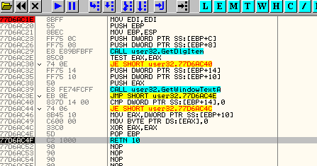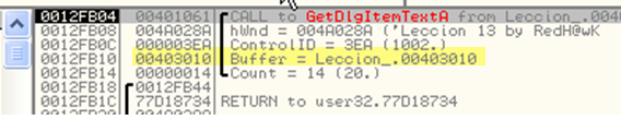 Если посмотрим стек, то увидим, что остановка произошла на GetDlgItemTextA, получающая введённый пользователем серийный номер, а в параметрах функции находится адрес буфера, куда он сохраняется, в данном случае – 403010.
