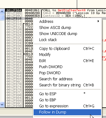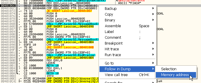 Посмотрим, что находится по этому адресу через DUMP. Правая кнопка мыши – FOLLOW IN DUMP.