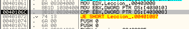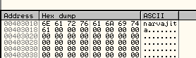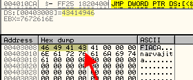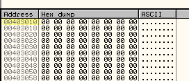 В 401066 в EBX перемещается содержимое памяти по адресу 403010, которое является DWORD’ом. Посмотрим, что находится по адресу 403010 через DUMP.