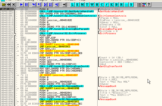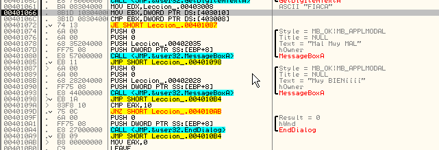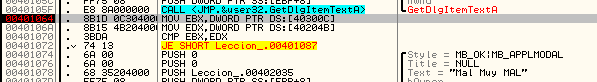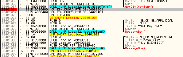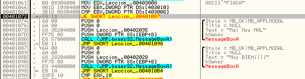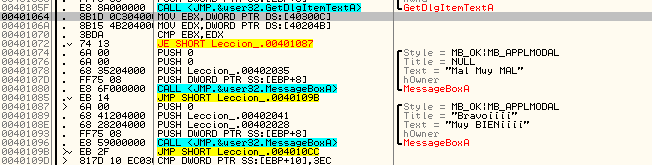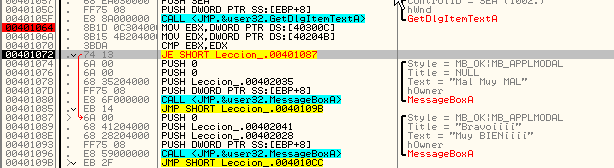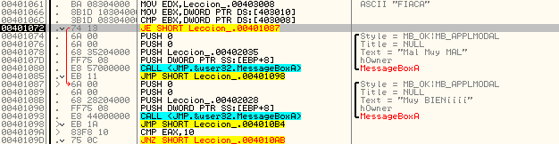 Увидим, что начинается сравнение и условный переход, который переходит либо на MessageBoxA, показывающий надпись “Mal Muy MAL” («плохо, очень плохо» - прим. пер.), либо на MessageBoxA, показывающий надпись “Muy BIEN” («очень хорошо» - прим.пер.) соответственно. Очевидно, что если мы исправим этот переход на JMP 401087, то будет всегда выполняться переход на вывод сообщения “MUY BIEN”, но в данном случае я хочу найти серийный номер, поэтому будем смотреть, что сравнивается.