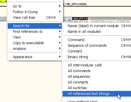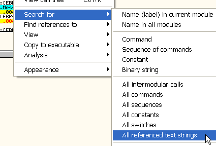 Чтобы найти строки, используемые программой, кликнем на правой кнопке мыши и выберем SEARCH FOR – ALL REFERENCED TEXT STRINGS.