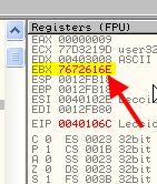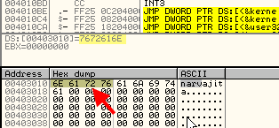 В пояснении видим, что там находится 7672616E, являющееся перевёрнутыми 4-мя байтами содержимого 403010, и это первые 4 байта неправильного серийного номера, который мы ввели. Они-то и были перемещены в EBX.