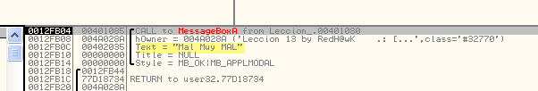 Видим, что переход произойдёт на MessageBoxA c MUY BIEN. Посмотрим с помощью F9.
