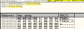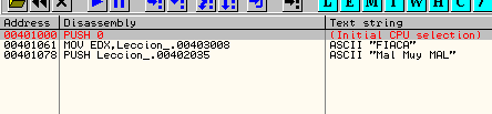 Видим, что там находятся первые четыре байта слова “FIACA”, которые и сравниваются с первыми четыремя байтами введённого серийного номера, из чего мы можем заключить, что если бы они были одинаковы, то активировался бы флаг Z, так как между ними не было было разницы, выполнился бы переход JE и вывелось бы сообщение “MUY BIEN”, но так как они не одинаковы, то нас ждёт суровое наказание, хе-хе.