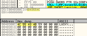 И при срабатывании BPX видим, что в EBX помещается содержимое памяти по адресу 40300C. Смотрим через DUMP.
