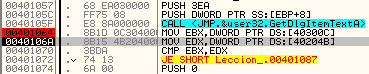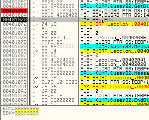 При сравнении EBX с EDX оба равны 38393839, что соответствует строке 9898, поэтому совершается переход на вывод окна MUY BIEN.