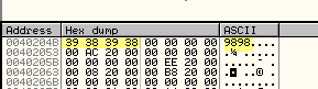 Там находятся четыре байта, соответствующие строке 9898 и являющиеся правильным серийным номер. Они сравниваются с четырьмя байтами введённого нами серийного номера, и если они одинаковы, то совершается переход в область MUY BIEN, но в данном случае этого не происходит, поэтому нам нужно вернуться и ввести 9898.