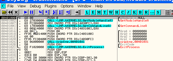 Это mielecrackme, загруженный в OllyDbg, и его точка входа. Посмотрим, какие функции API используются с помощью SEARCH FOR-NAME (LABEL) IN CURRENT MODULE.
