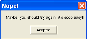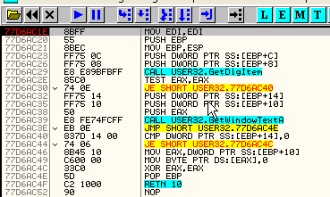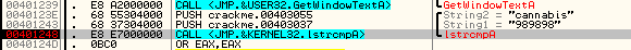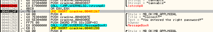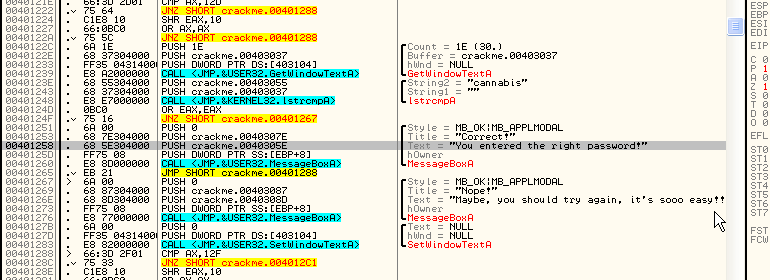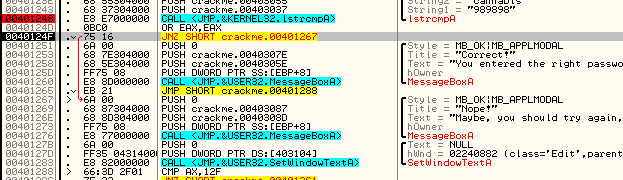 Сначала идёт GetWindowTextA, считывающая серийный номер, который мы напечатали, затем lstrcmpA, сравнивающая считанный номер с правильным, а затем, если они верны, MessageBoxA показывает «YOU ENTERED THE RIGHT PASSWORD», а если нет, то происходит переход к другому MessageBoxA, отображающему «YOU SHOULD TRY AGAIN, IT'S SO EASY» («Попробуй ещё раз, это же так просто»).