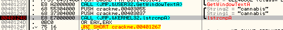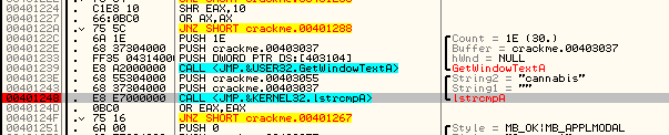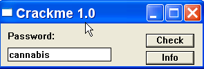 Раз мы делаем переход, то получаем сообщение с ошибкой, но зато теперь мы знаем, что сравнение происходит со словом «cannabis», то есть это и есть верный серийный номер. Снова продолжим выполнение программы.