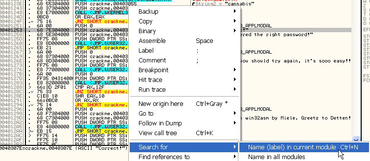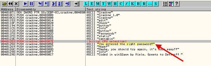 Здесь видим как строку, отображающуюся как в успешном случае, так и строку, показывающуюся в случае неудачи. Если сделаем на какой-нибудь из них двойной клик мышью, то окажемся в окрестностях MessageBoxA. Попробуем сделать двойной клик на “YOU ENTERED THE RIGHT PASSWORD” («Вы ввели правильный пароль»).