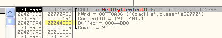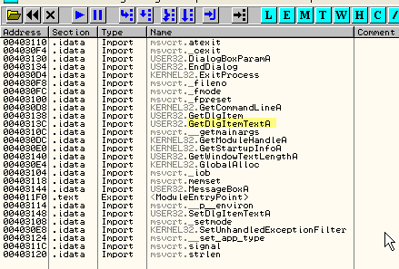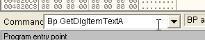 Мы уже знаем, как посмотреть используемые API-функции. В списке также есть GetDlgItemTextA, на который мы и установим BPX.