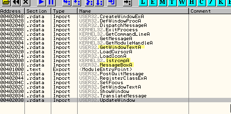 Среди них указаны самые важные: GetWindowTextA, использующаяся при вводе серийного номера, lstrcmpA, которая встречалась в предыдущей главе и используется для сравнения строк, и MessageBoxA, отображающая сообщение о том, верен ли серийный номер или нет.