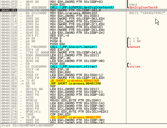 Мы можем установить BPX на эти функции, чтобы произошла остановка, когда будет введён неверный серийный номер, но в данном случае, который весьма прост, можно сделать всё гораздо быстрее, если посмотреть СТРОКИ, используемые программой.