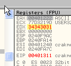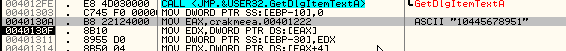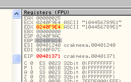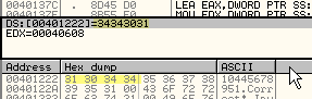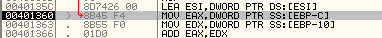 Следующая строка перемещает значение, находящееся по адресу EBP-30 (на моей машине равное 240f9E4, и оно указывает на начало номера-константы), в EDX.