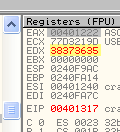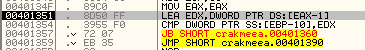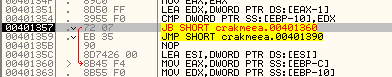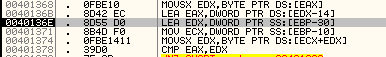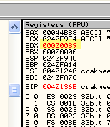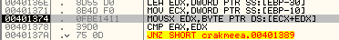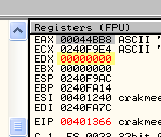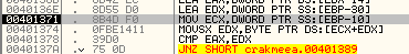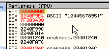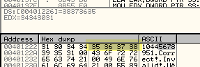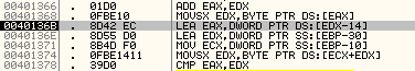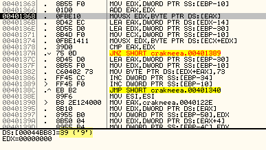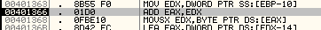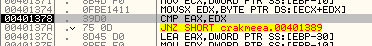 Так как EAX указывает на начало неверного серийного номер, прибавляем к нему EDX (который изначально равен нулю) для создания цикла, каждый увеличивая значение EDX на 1 (1, 2, 3 и т.п.), чтобы получить все байты неверного серийного номера по одном в указанном цикле.