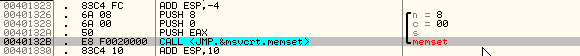 Видим, что чуть ниже находится вызов функции memset. Посмотрим её параметры с помощью OllyDbg.