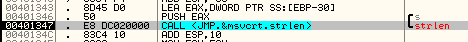 Ещё ниже находится вызов lstrlen, которая считает длину строки, адрес которой задаётся непосредственно до вызова самой функции.