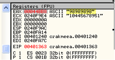 На следующей строке в EAX помещается указатель на наш неверный серийный номер, и поэтому когда нажмём на F7, то EAX будет указывать на “98989898”.