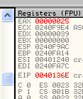 В EAX находится значение 25 (значение первого байта неверного серийного номера (39), от которого было отнято значение 14), а в EDX первый байт номера-константы или 31.