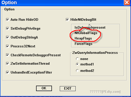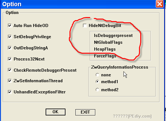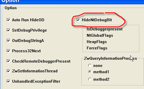 Это плагин HideOD, красным обведены опции, которые прячут OllyDbg от обнаружения с помощью этих флагов, но мы будем исследовать вручную.