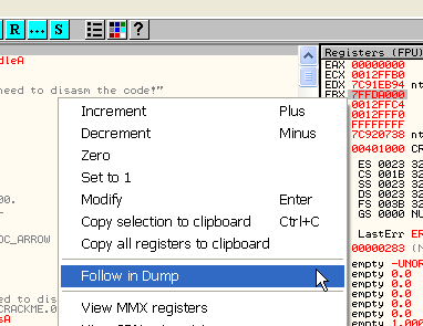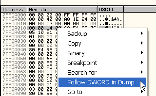 Отмечаем байти и выбираем FOLLOW DWORD IN DUMP, что перенесёт нас в область памяти, зарезервированной под "кучу".