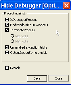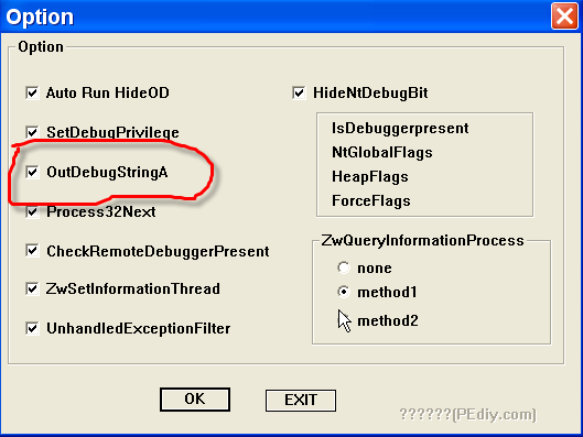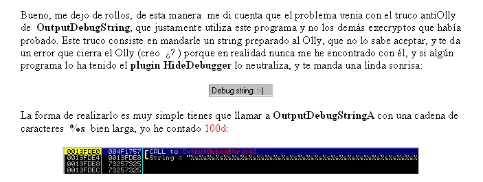 "Хорошо, таким же образом я понял, что проблема связана с противооллиным приёмом, основанный на OutputDebugString и использованный данной программой. Этот приём заключается в передаче Олли специально подготовленной строки, которую та не может обработать, и происходит ошибка, закрывающая OllyDbg. В реальности я никогда не встречался с этим, так как плагин HideDebugger нейтрализует данный антиотладочный метод и выдаёт следующее сообщение: