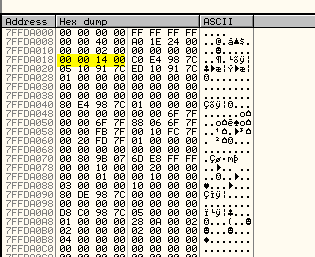 К значение, которое содержится в EBX на точке входа, надо прибавить 18, это адрес, по которому в моём случае лежит 014000, это тоже адрес - адрес "кучи", то есть область памяти, созданная при запуске программы, куда та может помещать какие-то свои данные, не будем заострять на этом много внимания.