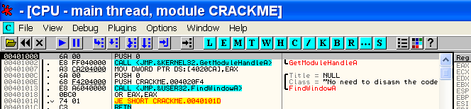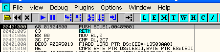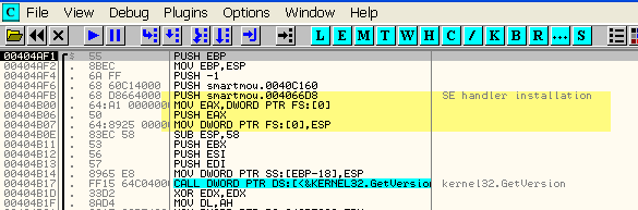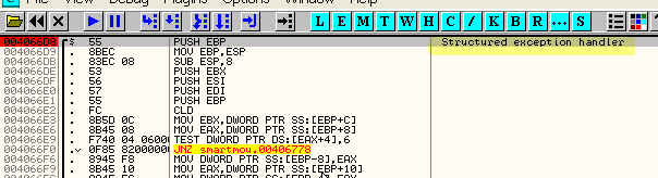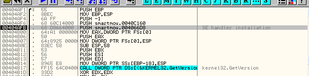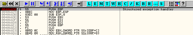 Здесь видно, что в начале программа собирается установить собственный обработчик исключений, о чём прямо говорится в комментарии OllyDbg.