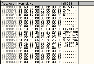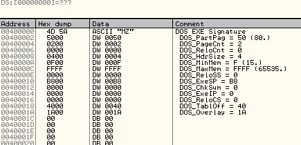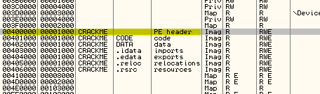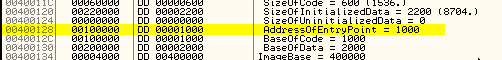 Видим, что секция, начинающаяся с 400000, т.е. первая, являющаяся заголовком PE (исполняемого файла), имеет небольшой размер в 1000 байт, в котором хранятся данные о секциях, именах, размере, в общем, всю необходимую информацию о запуске файла.