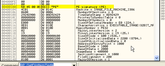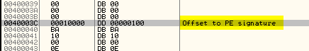 Если начнём спускаться вниз, то первое, что мы встретим – это PE SIGNATURE, являющееся значением, которое говорит нам, где действительно расположена информация о заголовке. Видим, что оно содержит 100, так что нужно прибавить это число к 400000 и получим 400100. Спускаемся туда.