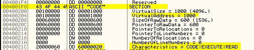 Здесь начинаются данные секций, видим, что секция начинается с позиции 1000, т.е. 401000, а её характеристиками являются CODE, EXECUTE и READ.