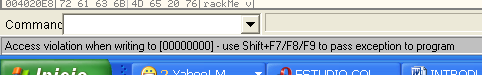В данном случае есть только к ячейке памяти по адресу 401057 есть только право на чтение и исполнение, но не на запись, поэтому при попытке записать что-либо в данную позицию возникает исключение. Нажмём F8.