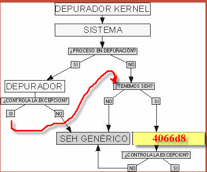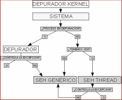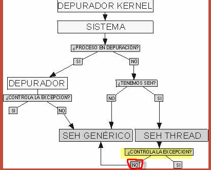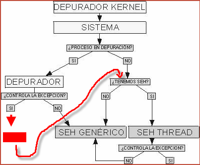 В случае, если программа находится под отладкой, контроль получает отладчик, который (как это изображено на картинке, смотрит, может ли он контролировать исключение или нет, почти всегда ответ утвердительный и тогда, если включена опция в DEBUGGING OPTIONS-EXCEPTIONS для перепрыгивания через этот тип исключений, контроль возвращается обратно программе, если не включена, то для этого нужно нажать SHIFT+F9, то есть на графике, где сказано CONTROLA LA EXCEPCION-SI отсутствует изображение, отображающее процесс принятия решения, останавливать или продолжать выполнение программы в зависимости от вышеуказанной опции. Смотрим следующую схему.