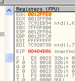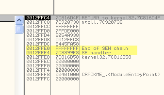 Как видим в стеке, 12ffe0 указывает на последний обработчик в цепочке, то есть на тот, который работает именно в данном треде, и именно по этому адресу происходит передача управления, когда возникает исключение. Системный обработчик при этом отображает нам знаменитое сообщение об ошибке в приложении.