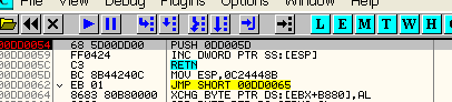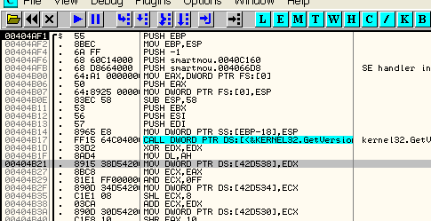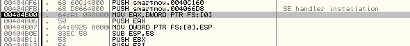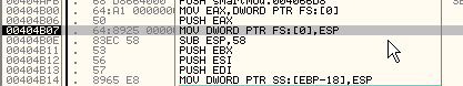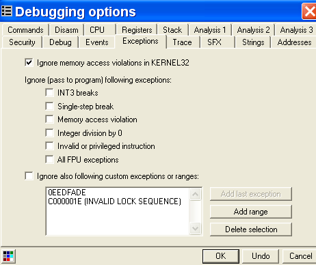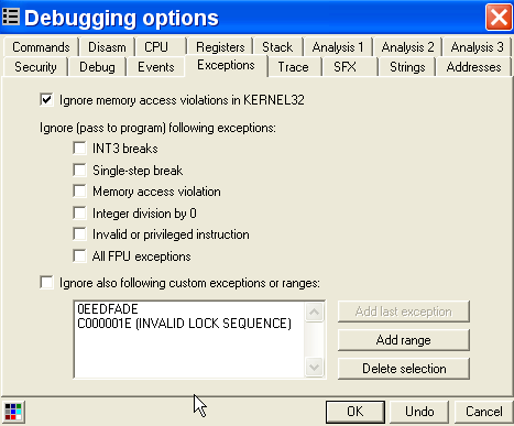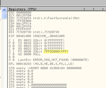 Очевидно, что если хотим остановиться в том момент, когда программа устанавливает обработчик исключений, то лучше создать HARDWARE BPX ON WRITE в FS:[0]. Во многих случаев DLL также устанавливают обработчики, затем они убираются и при возвращении в программу остаются те, которые были раньше, и вышеуказанным образом можно контролировать их установку и снятие во время выполнения программы.