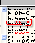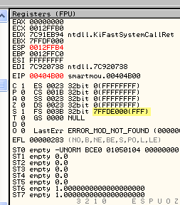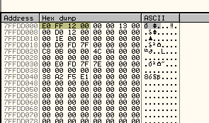 Как можно видеть, FS:[0] – это содержимое памяти по адресу, отмеченное OllyDbg, оно может быть разным на разных машинах, но в моём случае FS:[0] всегда содержит 12ffe0.