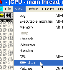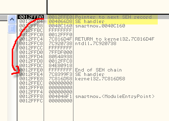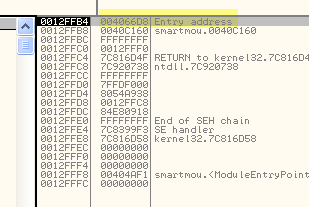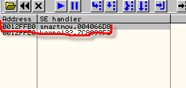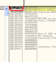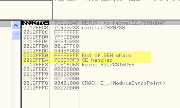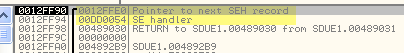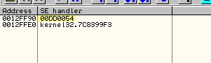 OllyDbg говорит нам, что это SEH-обработчик, первое значение указывает на старый, а второй – это адрес, по которому будет передано управление, когда возникнет исключение.
