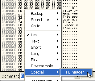 У OllyDbg есть опция для интерпретация большинства параметров заголовка. Находясь в DUMP, нажимаем на правую кнопку мыши.