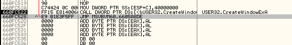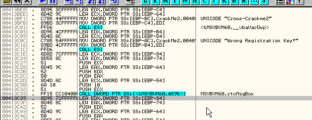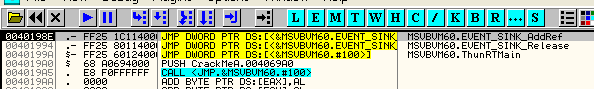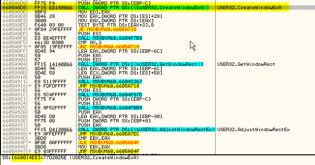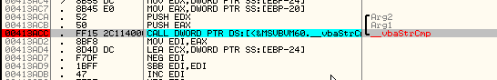 Видим, что API-функция вызывается из DLL Visual Basic'а, смотрим, откуда происходит вызов, информация об этом содержится в первой строке стека. Идём туда.