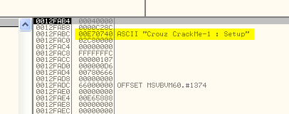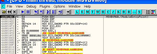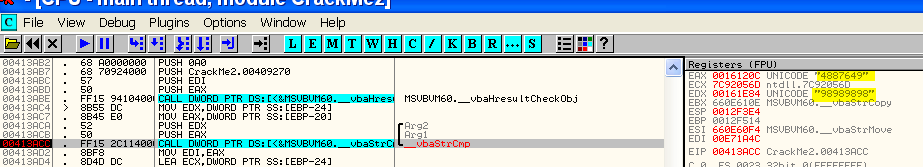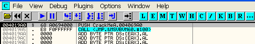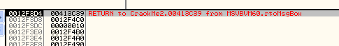 Теперь открываем CrackmeA в версии OllyDbg, пропатченной на предмет OEP’ов и Visual Basic’а.