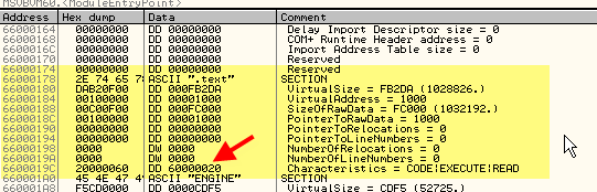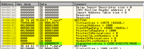 Спускаемся оттуда, где начинается PE SIGNATURE заголовка, до места, где находится первая секция.