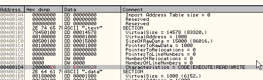 Сначала, для того чтобы убрать наг-окно, нужно сделать возможным модификацию крэкми, то есть установить разрешение на запись в секцию кода, для чего идём в заголовок программы, который начинается с 400000.