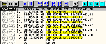 Видим, что в первый раз останавливаемся на первом JMP и переходим на 40bd80, то есть здесь выполняется первая часть программы. Смотрим, появляется ли наг-окно до того как происходит возврат к этим переходам. Убираем BPM ON ACCESS, так как сейчас будет выполняться значительная часть программы в секции кода, и останавливаться на каждой строке нам совсем не нужно, лучше установим BP на эти конкретные переходы в разные части программы.