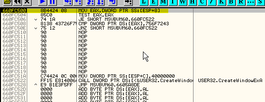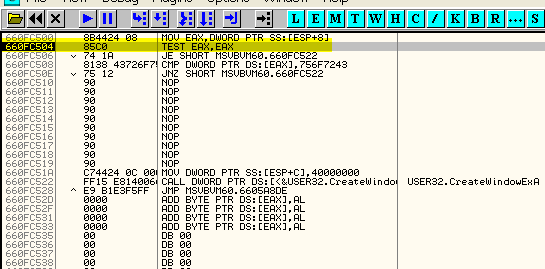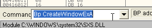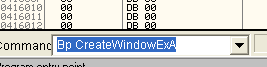 Открываем в OllyDbg крэкми, которое нам нужно пропатчить, останавливаемся, когда поверх окна ввода серийного номера появляется наг-окно, устанавливаем BP на API-функцию создания окон с помощью команды “Bp CreateWindowExA”.