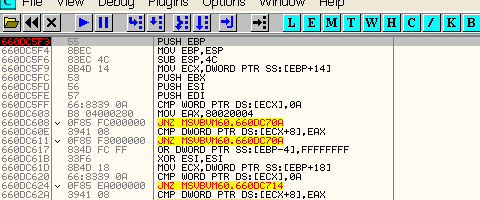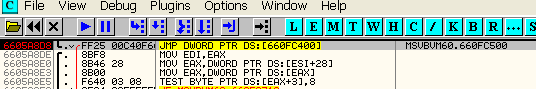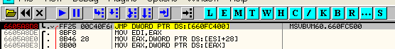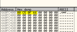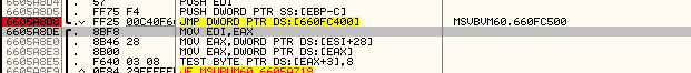 Делаем косвенный переход, который содержит адрес 660fc400, указывающий на место, находящееся чуть ранее моей вставки, где хранится собственно её адрес. Можно было бы сделать прямой переход, но ладно, обе возможности равноценны.