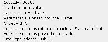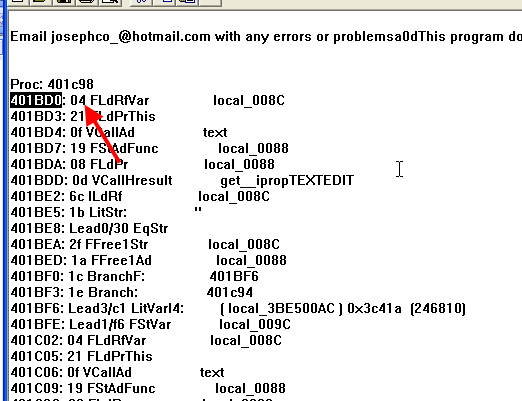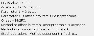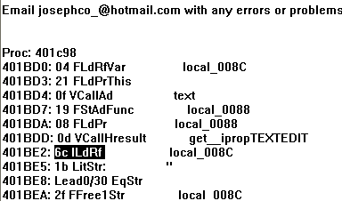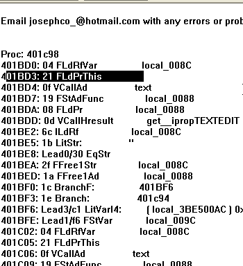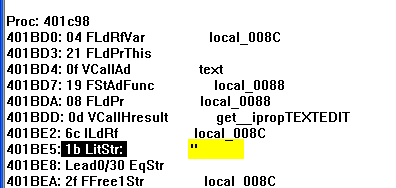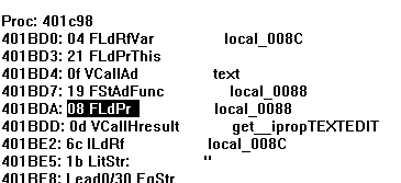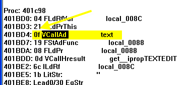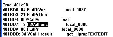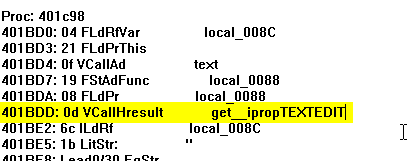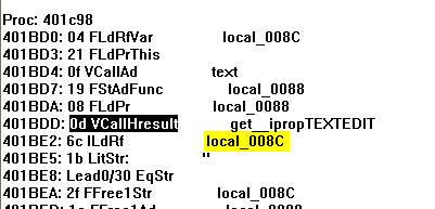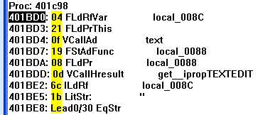 401C02: 04 FLdRfVar local_008C 401C05: 21 FLdPrThis 401C06: 0f VCallAd text 401C09: 19 FStAdFunc local_0088 401C0C: 08 FLdPr local_0088 401C0F: 0d VCallHresult get__ipropTEXTEDIT 401C14: 6c ILdRf local_008CВсё похоже на то, как было в начале. Следующий опкод: