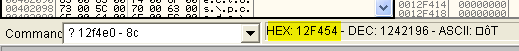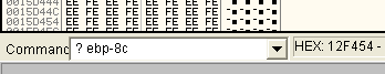 То есть это эквивалент PUSH EBP-8c – выделение в стеке места для локальной переменной. На моей машине EBP равен 12f4e0, если отнимем 8c, то получится 12f454, то есть значение, которое останется в EAX и будет передано инструкции PUSH.