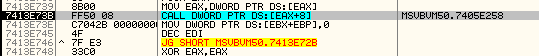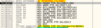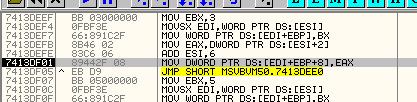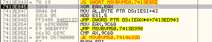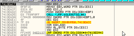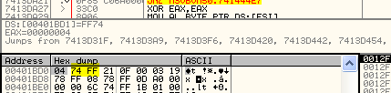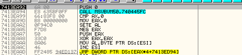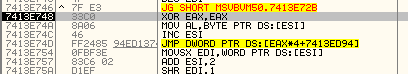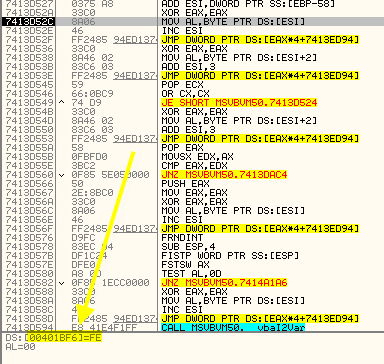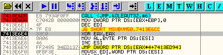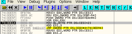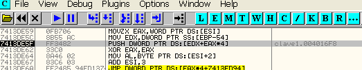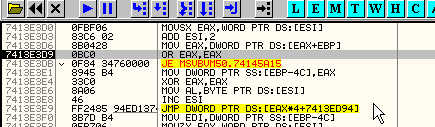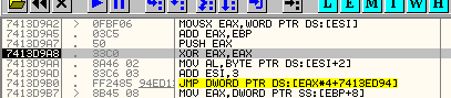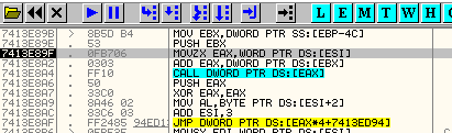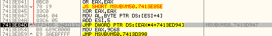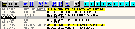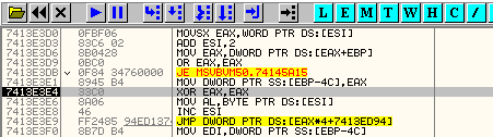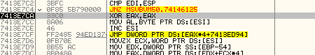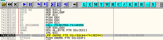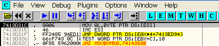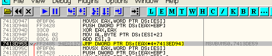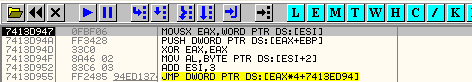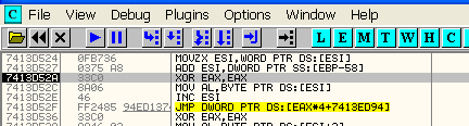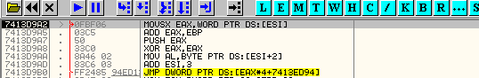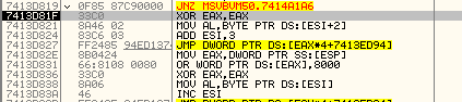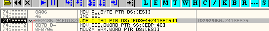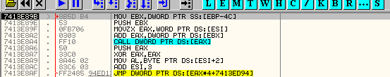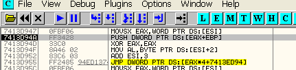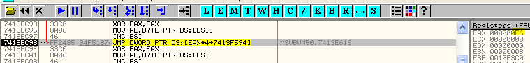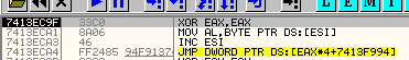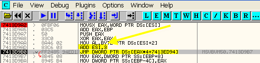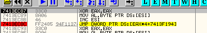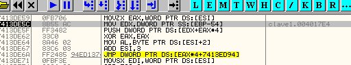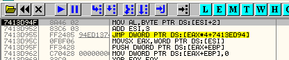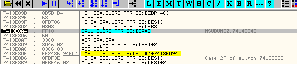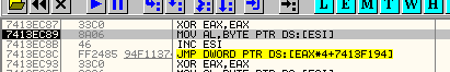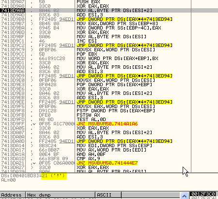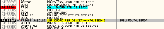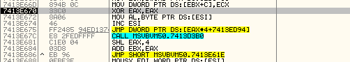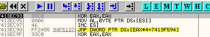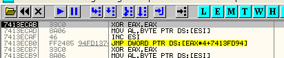 Затем наконец доходим до косвенного JMP, который отправляет нас к строкам, выполняющим опкода, в данном случае это 04, как видим в EXDEC’е.